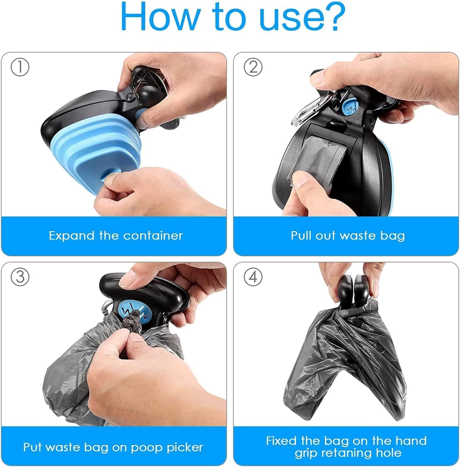 [SÉCURITÉ ET ÉCONOMIE D'ENERGIE] Plus besoin de se salir les mains en ramassant les excréments. Dépliez la partie pliée pour augmenter la capacité, puis sortez un nouveau sac du compartiment et placez-le sur la pelle. Appuyez sur la poignée pour ramasser les excréments, retournez le sac et enroulez-le autour des excréments avant de le jeter à la poubelle.